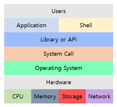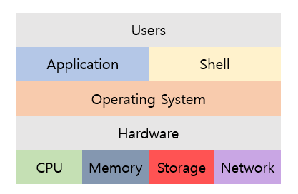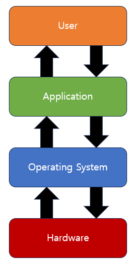 - 사용자, 응용 프로그램, 운영체제, 컴퓨터 하드웨어와 관계