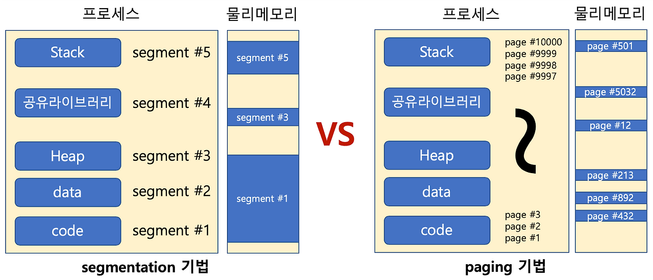 - 세그멘테이션은 크기가 다른 segment 단위로 물리 메모리에 로딩