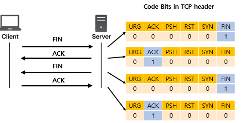 -> FIN/ACK(Seq=u), ACK(ACK=u+1), FIN/ACK(Seq=2, ACK=u+1), ACK(Seq=u+1, ACK=w+1)의 단계로 진행