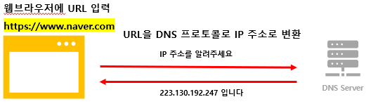- 웹브라우저에 입력된 URL은 DNS 프로토콜을 사용하여 IP 주소로 변환