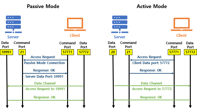 - Active Mode는 서버가 클라이언트에 접속하므로, 클라이언트 방화벽에 따라 에러가 발생할 수 있음