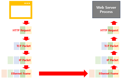 - HTTP Request는 운영체제 네트워크 스택을 따라 HTTP->TCP->IP->Ethernet을 전기신호로 변환 후 전송