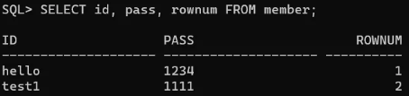 5. SELECT문에 id, pass 컬럼을 지정하고 rownum 사용 → rownum 컬럼을 만들지 않았음에도, rownum 컬럼에 순번이 출력됨