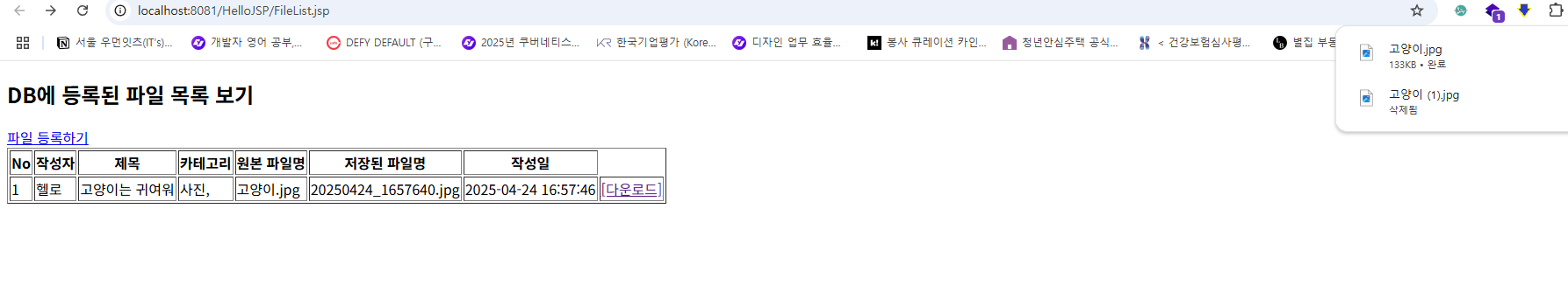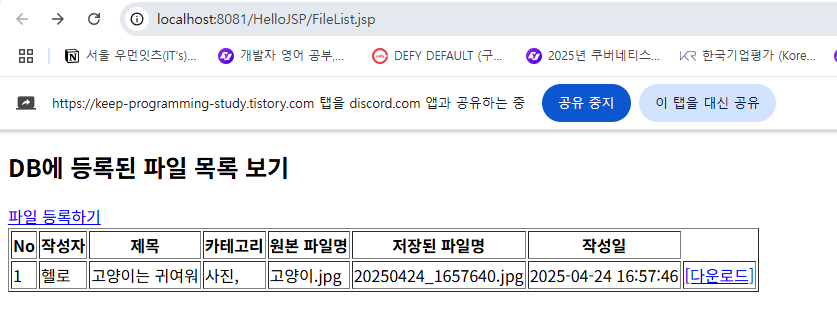 3) FileList.jsp 우클릭하고, Run As -> Run On Server를 클릭하여 실행한 후 [다운로드] 클릭