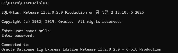 - 명령 프롬프트(cmd)에서 sqlplus 명령으로 오라클 데이터베이스에 연결한 후, 사용자이름 hello 비밀번호 1234로 로그인