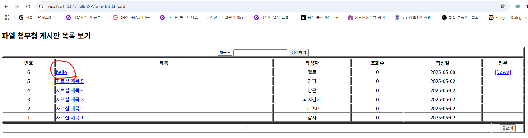 4) Default.jsp 실행 후 동작 확인: 원하는 글의 제목을 클릭하면, 해당 글의 내용을 상세보기 페이지에서 볼 수 있음