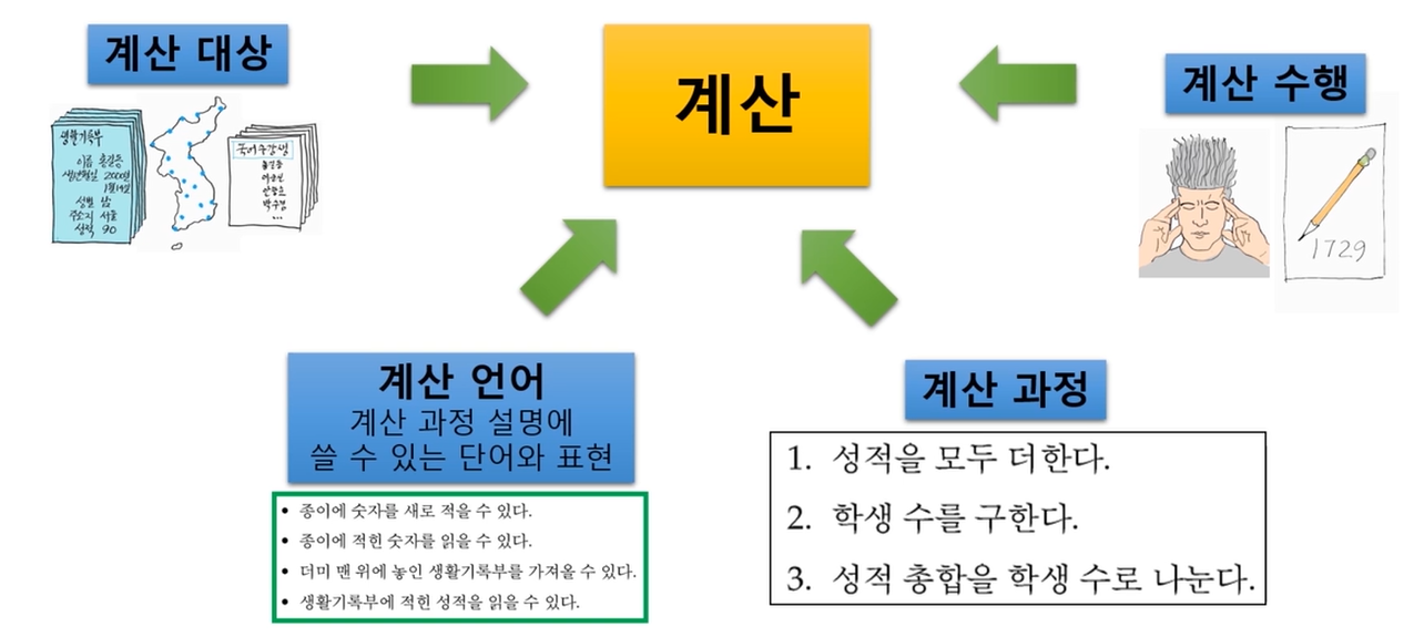 -실제 답을 구할 아이디어를 찾아 계산을 설계하고, 계산 언어에서 허용하는 단어와 표현만을 조합하여 기술