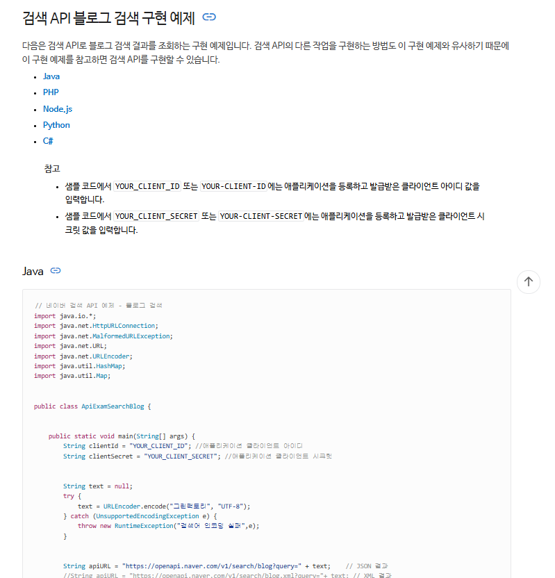 -> 바로가기 링크: https://developers.naver.com/docs/serviceapi/search/blog/blog.md#%EB%B8%94%EB%A1%9C%EA%B7%B8 - 본격적으로 프로젝트를 시작하기 전에 Java 언어 중심으로 문서를 많이 봐 두기