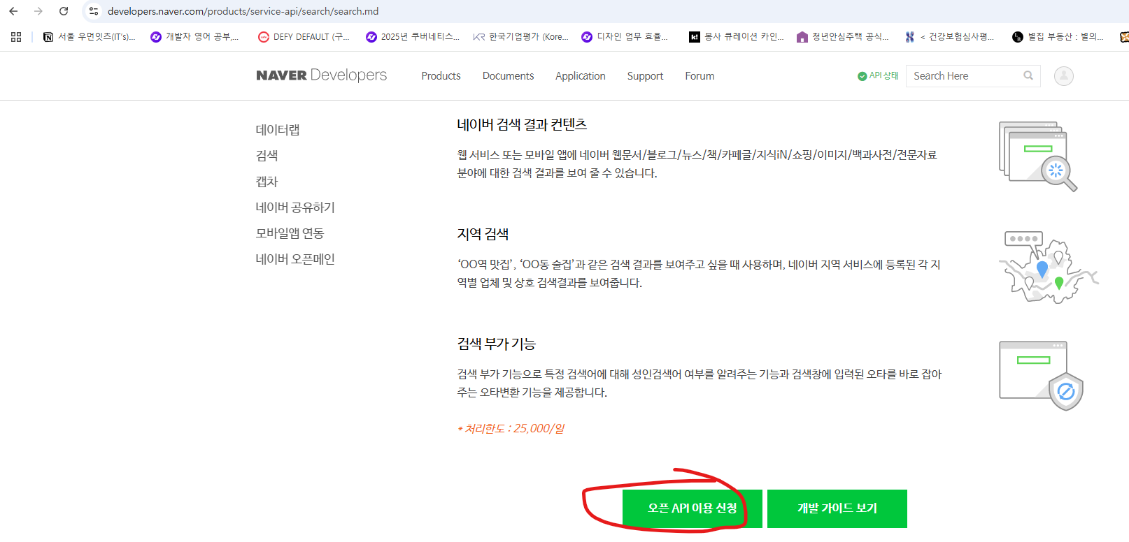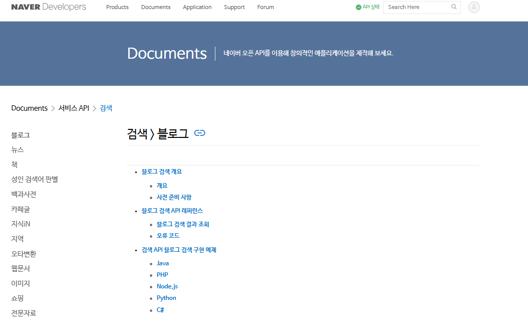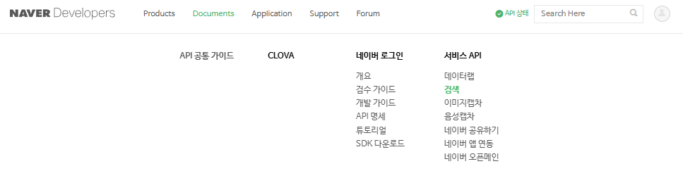 - "네이버 개발자센터"에서 [Documents] -> [검색] 메뉴를 클릭하여 확인