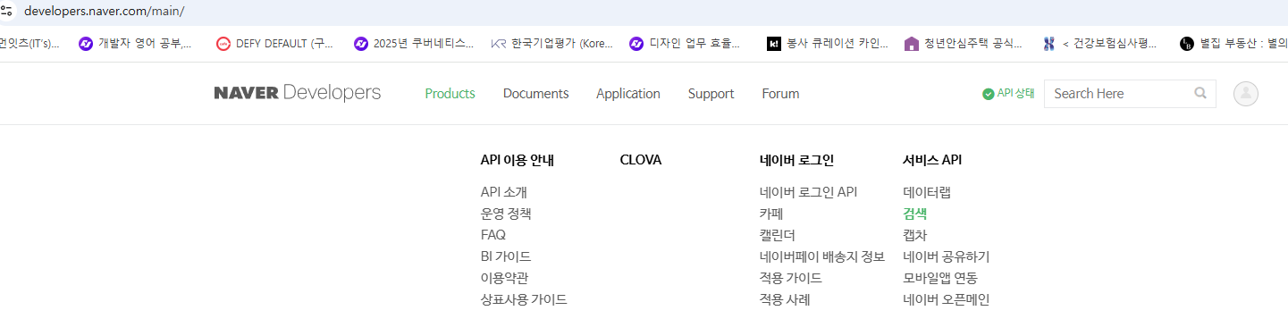 2) 네이버 개발자센터 링크에서 [Products] -> [검색] 클릭