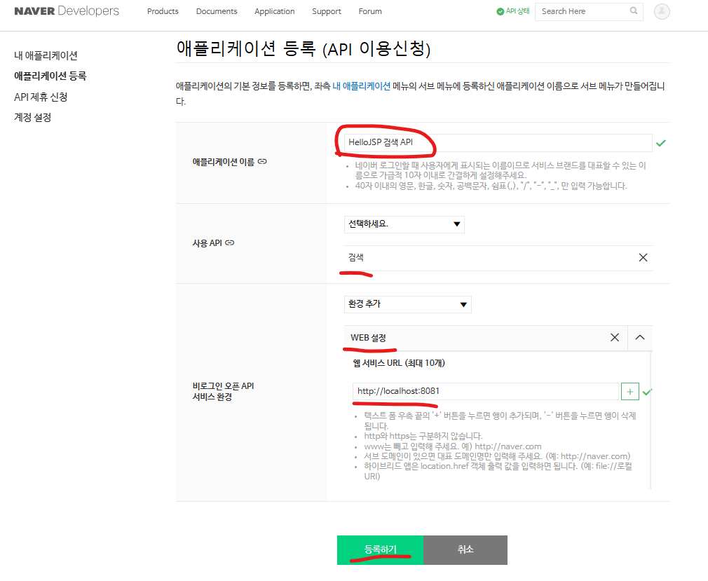 4) [애플리케이션 등록] 페이지에서 아래와 같이 입력(동그라미 친 부분은 자유롭게) 후 [등록하기] 클릭