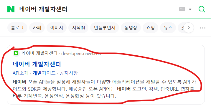 1) https://www.naver.com/에 접속하여 로그인한 후, 검색창에서 "네이버 개발자센터" 입력 후 검색버튼을 누르고 검색결과 창에서 링크 클릭