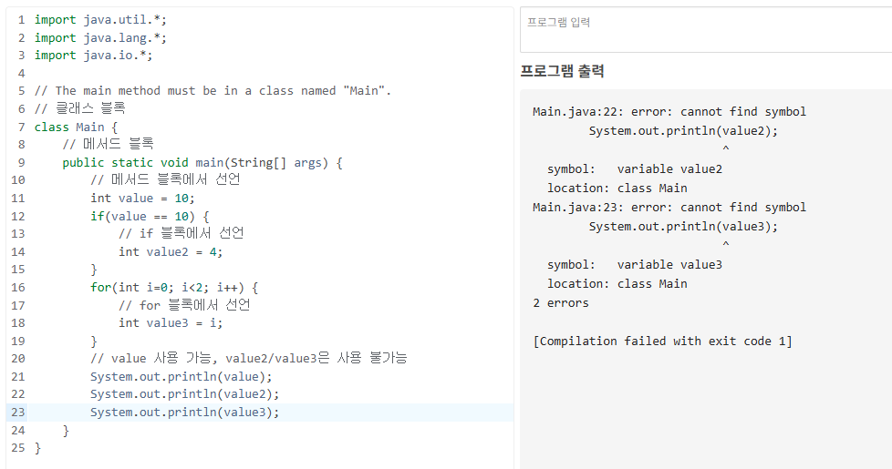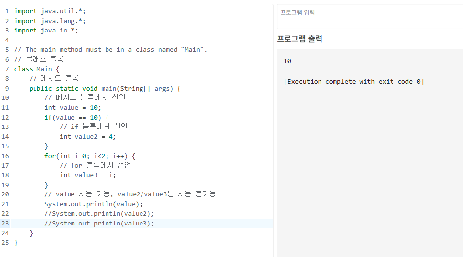 - 블록 내 어디서든 선언할 수 있지만, 선언된 위치로부터 자신이 속한 블록 내부에서만 사용 가능