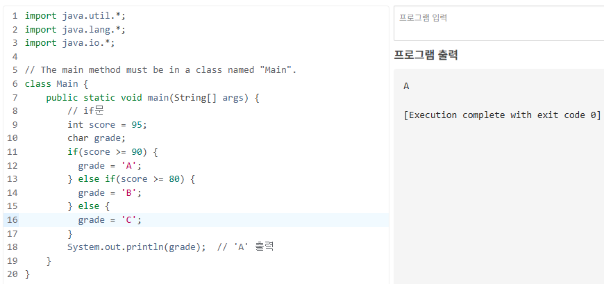 if문이 조건식이 true면 if문 블록이 실행되고, false면 else 블록 실힝]