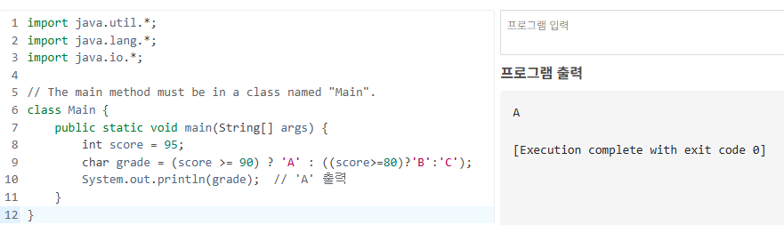 - 조건식(피연산자1) ? 값 또는 연산식(피연산자2) : 값 또는 연산식(피연산자 3)