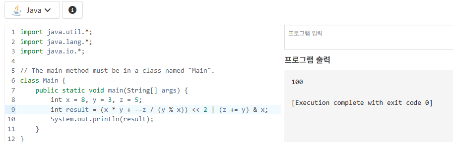 (x * y + --z / (y % x)) << 2 | (z += y) & x (비트 OR 연산) → 100 | 0 = 100