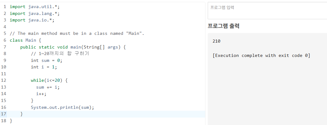// 1~20까지의 합 구하기