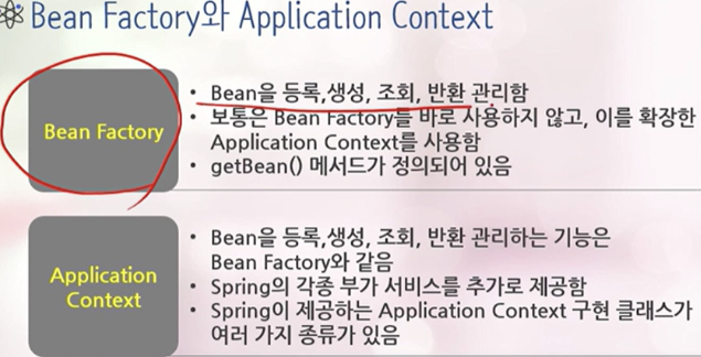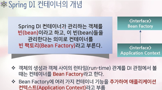 - Spring 컨테이너 = 빈 팩토리 = 어플리케이션 콘텍스트 (인터페이스)