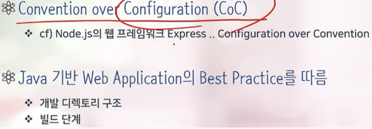 - Convention over Configuration(CoC): 개발자들이 자주 쓰는 로직(Best Practice)에 대한 설정 (Convention)을 미리 정의해둠.