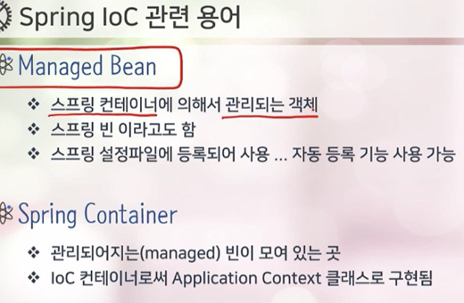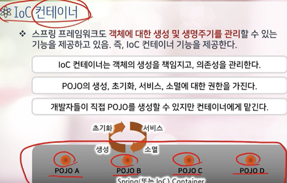 - 스프링 프레임워크 자체가 IoC 컨테이너를 포함하고 있음