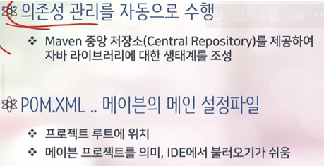 - 메이븐은 의존성을 하나의 중앙 저장소(Maven 중앙 저장소)에 모아두고 관리함.