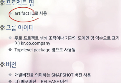 - 그룹 아이디: 위처럼 이름을 정해야, 다른 기관에서 만든 프로젝트와 충돌할 일이 없음