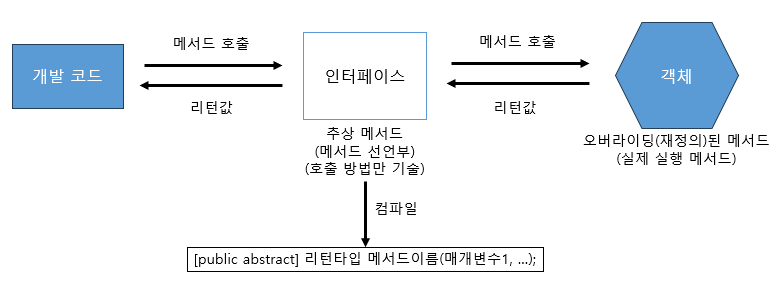 => 개발 코드는 객체 내부 구조를 알 필요가 없고, 인터페이스의 메서드만 알고 있으면 됨 - 여러 객체들과 사용이 가능하므로, 사용 객체에 따라 실행 내용과 리턴값 다양화