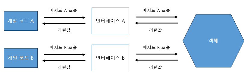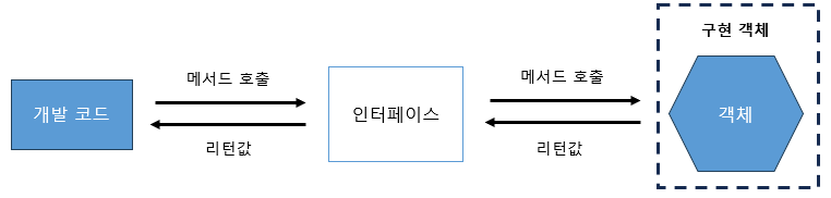 -> 개발 코드를 수정하지 않고 사용하는 객체를 변경할 수 있도록 하기 위함 - 개발 코드가 인터페이스의 메서드를 호출하면, 인터페이스는 객체의 메서드를 호출