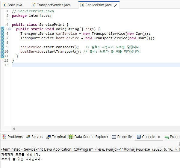 boatService.startTransport(); // 출력: 보트가 물 위를 떠다닙니다.