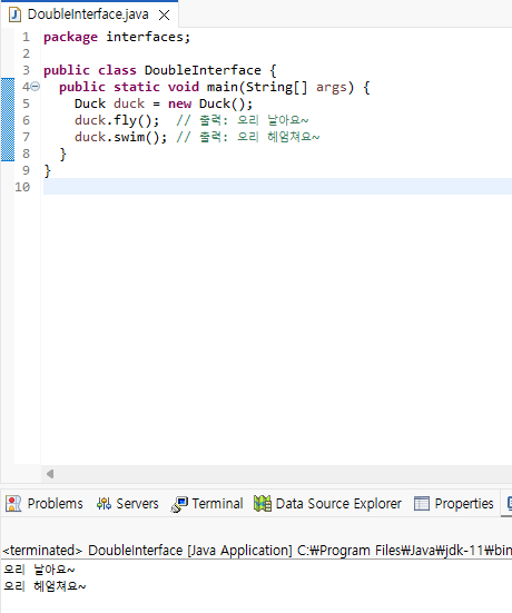 duck.swim(); // 출력: 오리 헤엄쳐요~