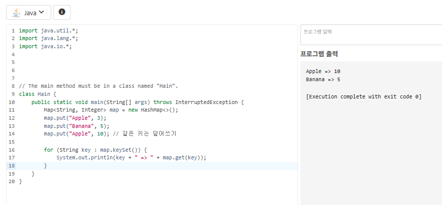 - 키는 중복 불허, 값은 중복 가능