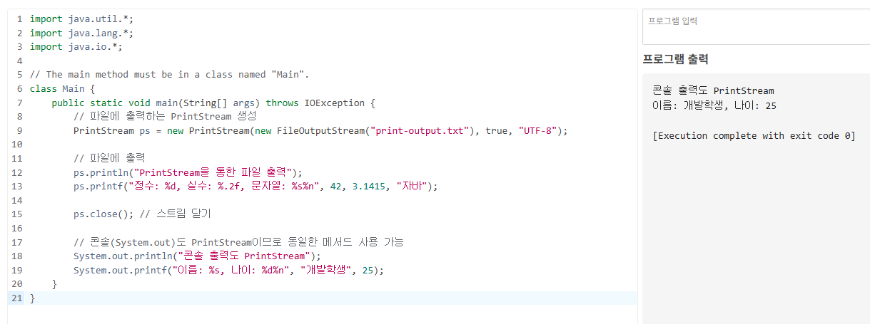 - 콘솔 로그 출력(System.out 자체가 PrintStream), 디버깅 정보 기록, 파일 로그 시스템, 형식 지정 출력에 사용