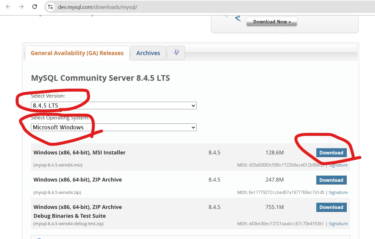- MySQL Community Server 8.0.42 설치 https://dev.mysql.com/downloads/mysql/