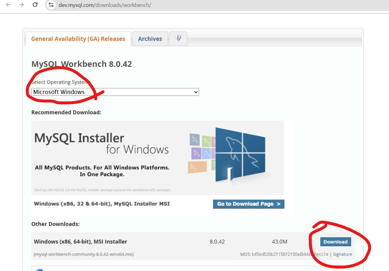 - https://dev.mysql.com/downloads/workbench/ 에서 운영 체제를 Windows로 설정한 후 download를 클릭하여 설치