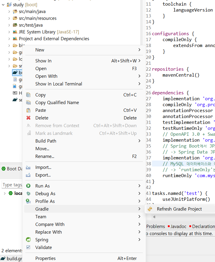 2) build.gradle 우클릭 후 Gradle -> Refresh Gradle Project 클릭