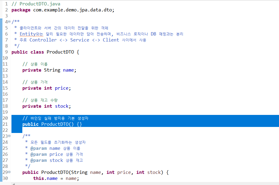-> Java는 기본적으로 런타임에 파라미터 이름 정보를 유지하지 않기 때문에, 이 정보를 알 수 없어 바인딩 실패- ProductDTO에 기본 생성자를 추가해야 함