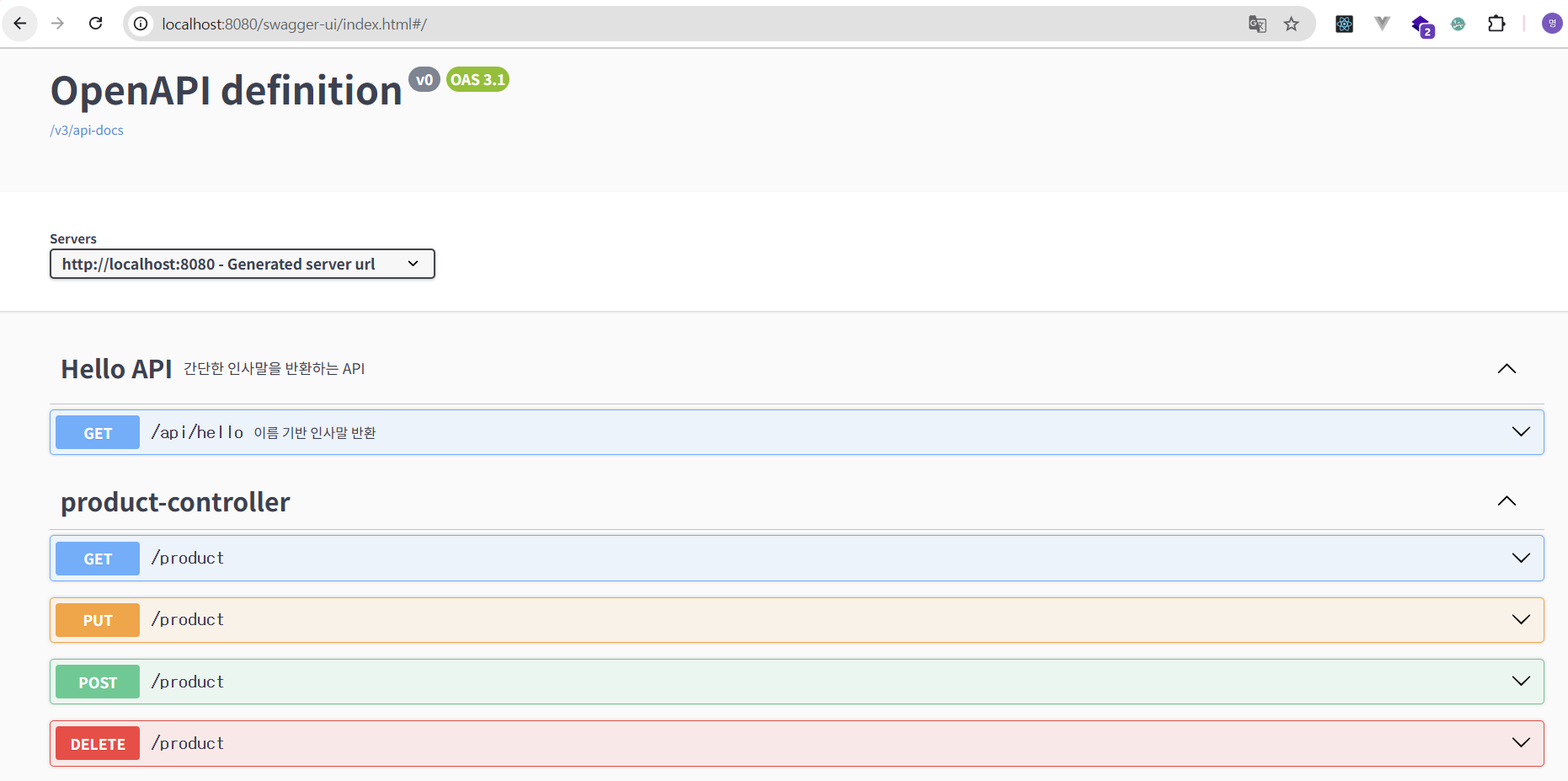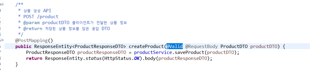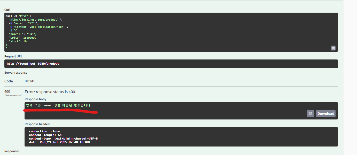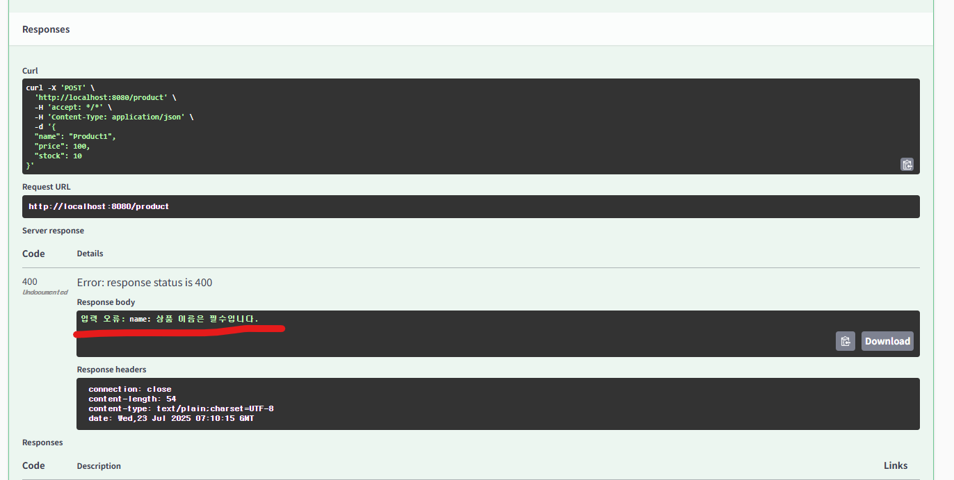 -> createProduct() 메서드 호출 전에 Spring이 productDTO.name이 null임을 감지하고, 예외를 던져 메서드 실행을 막은 것- 예외 메시지를 Swagger에 표시하는 클래스를 추가하기...