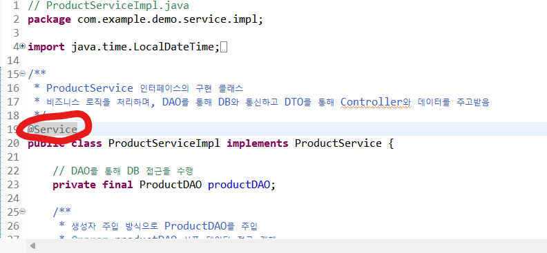 * 생성자 주입 방식으로 ProductRepository를 주입받음(테스트와 유지보수에 유리)