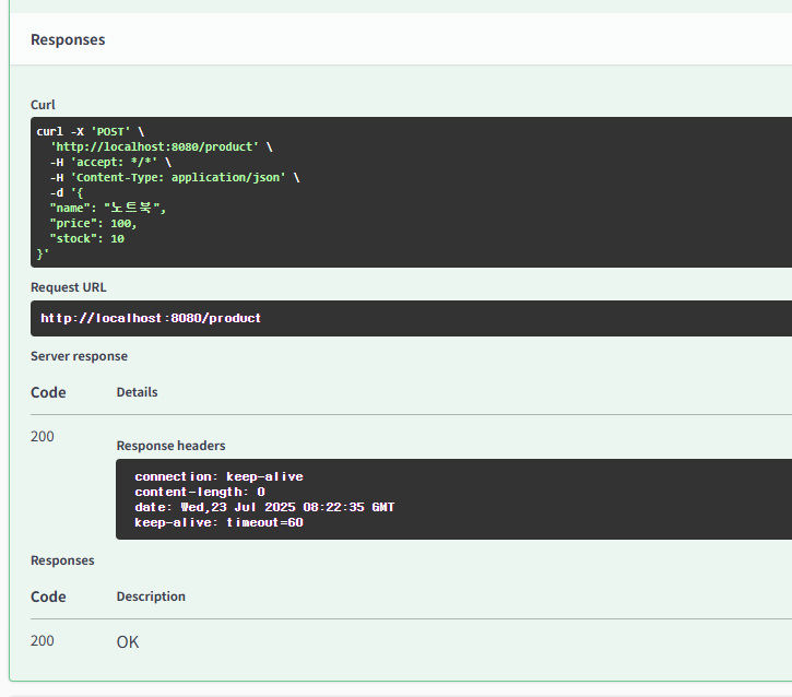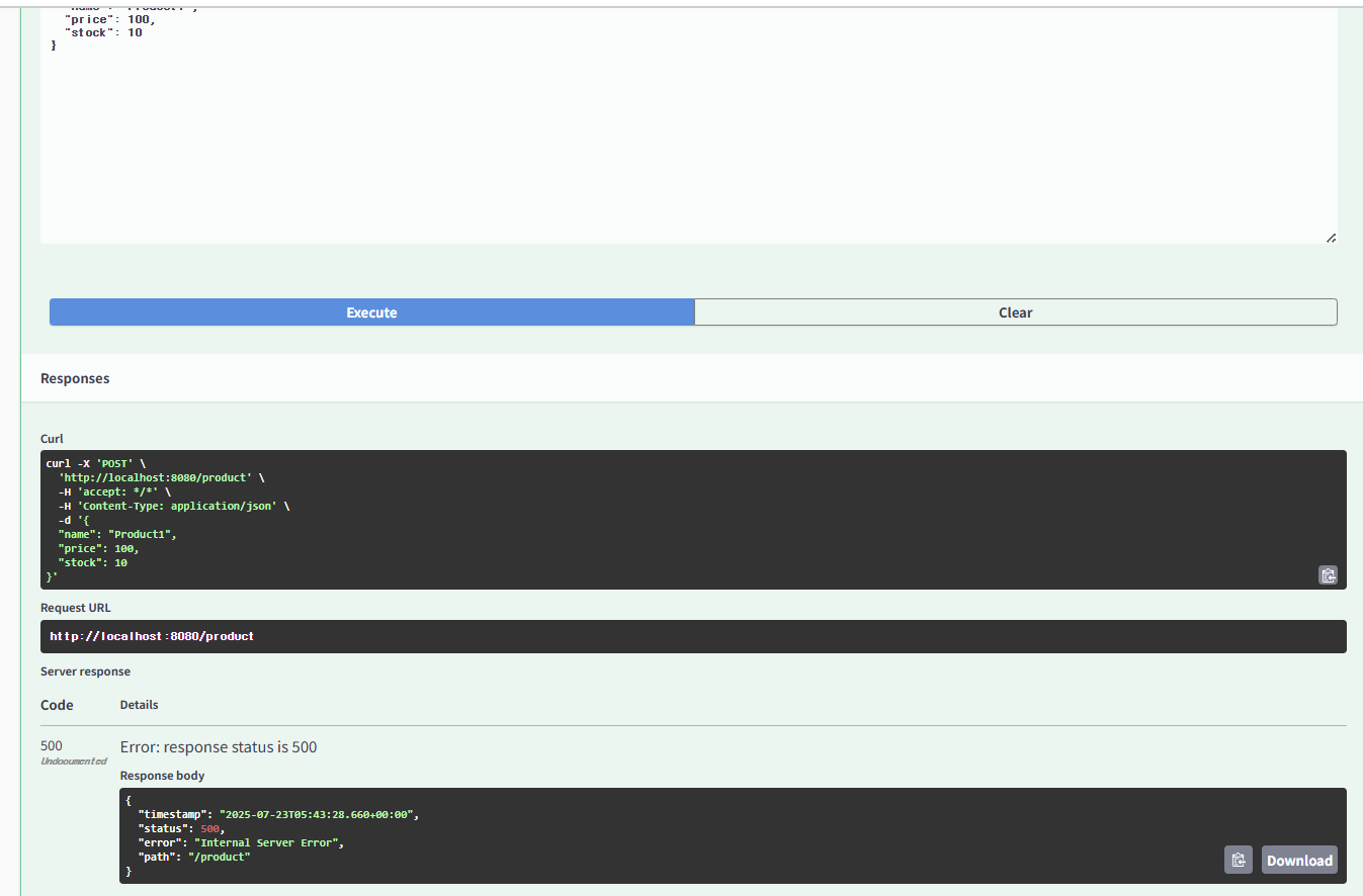 => CMD에서 curl -X POST http://localhost:8080/product -H "Content-Type: application/json" -d "{\"name\": \"노트북\", \"price\": 1500000, \"stock\": 10}" 명령어로 직접 시도해봤는데도 X