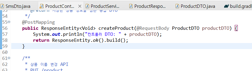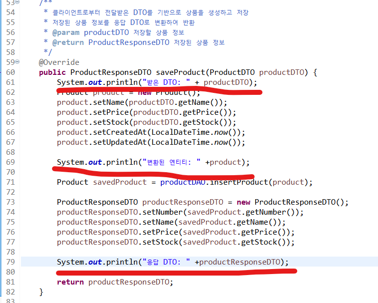 - System.out.println()을 ProductServiceImpl.java의 saveProduct 메서드에 넣고,