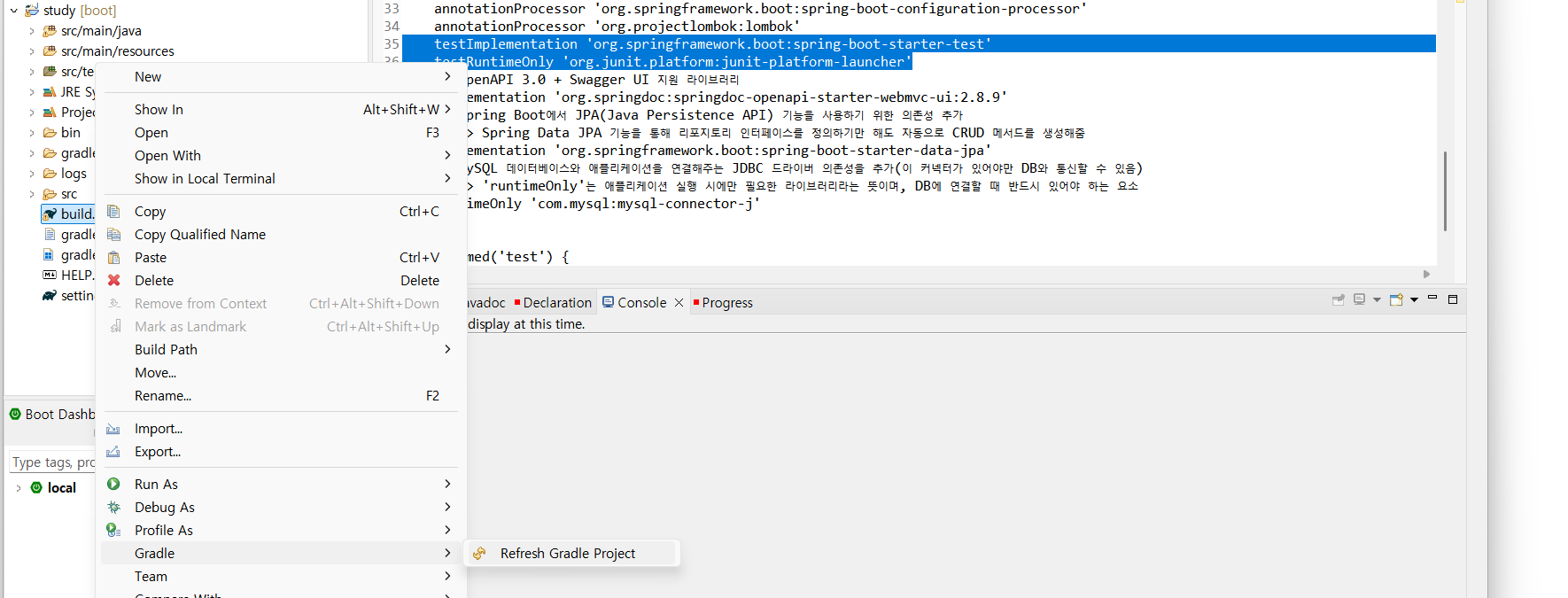 (2) build.gradle 우클릭 후 Gradle -> Refresh Gradle Project 클릭