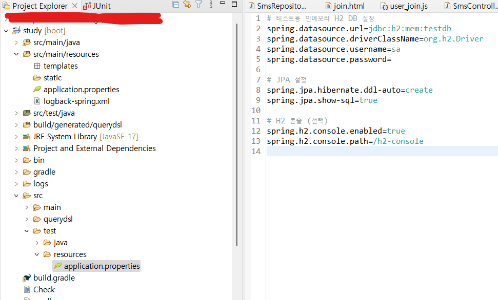 (4) src/test/resources에 application.properties 새로 생성(테스트 전용 설정으로 분리)
