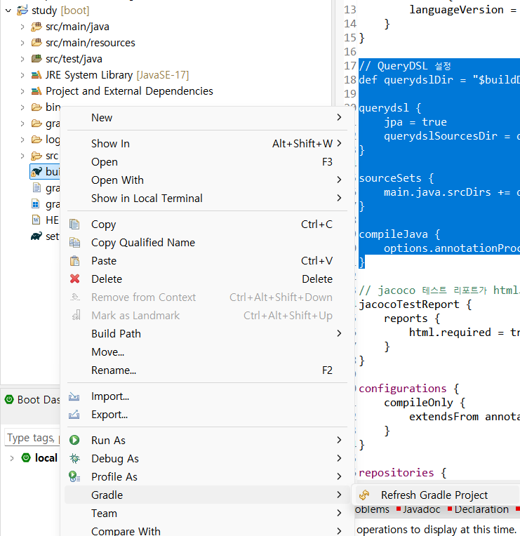 (2) build.gradle 우클릭 후 Gradle -> Refresh Gradle Project 클릭