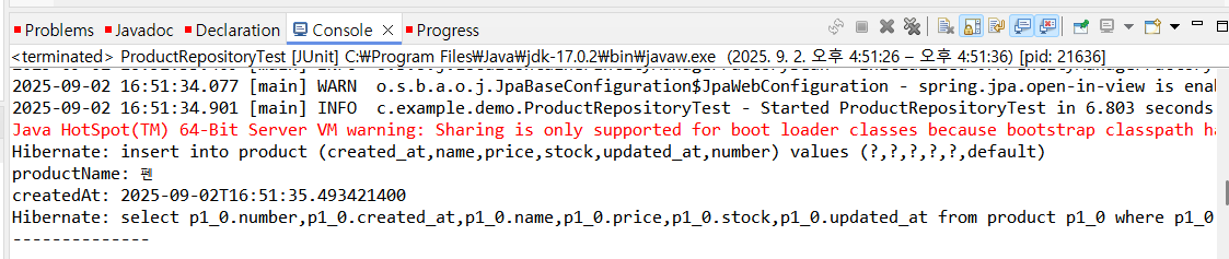 *ProductRepositoryTest.java를 우클릭해서 Run As -> JUnit Test를 클릭한 결과