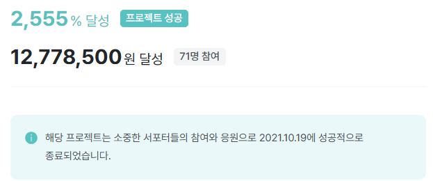 그래서 펀딩률 1000%와 펀딩 금액 1,000만원 이상을 달성하면서 성공적으로 끝날 수 있었다.. 정말 감사했습니다.