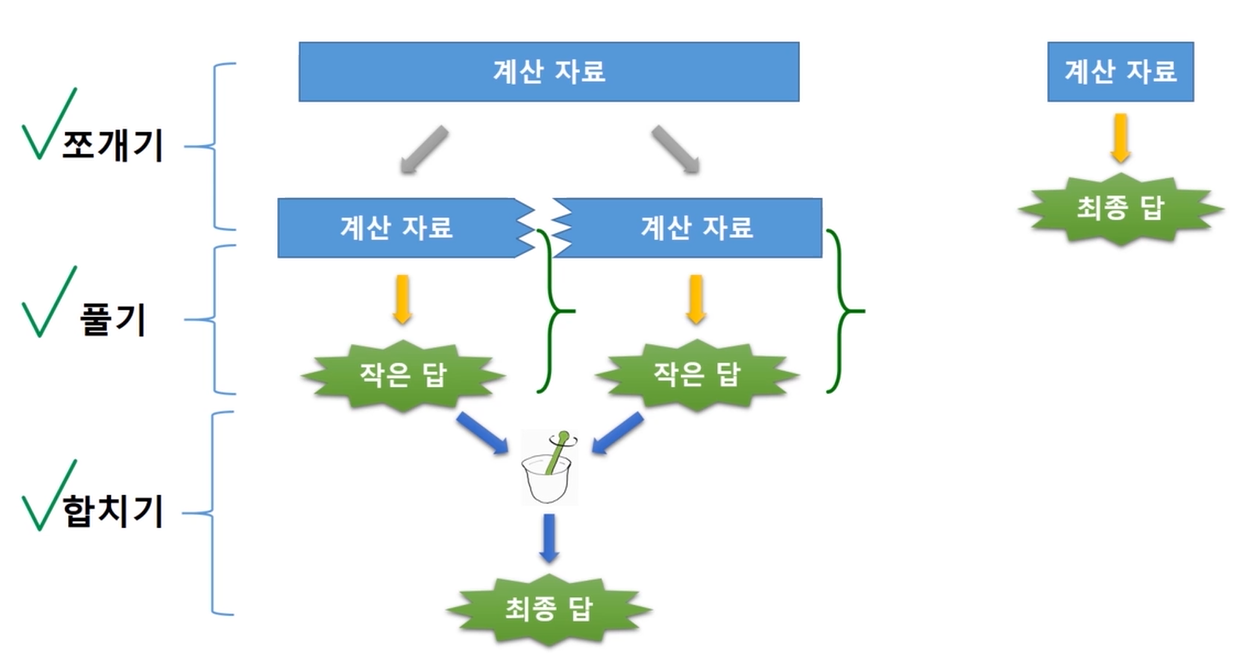 - 계산 자료를 여러 개로 쪼갠 뒤 쪼개서 나온 계산 자료들로부터 각각 답을 구하고, 이를 조합하여 원래 문제의 답을 찾아냄