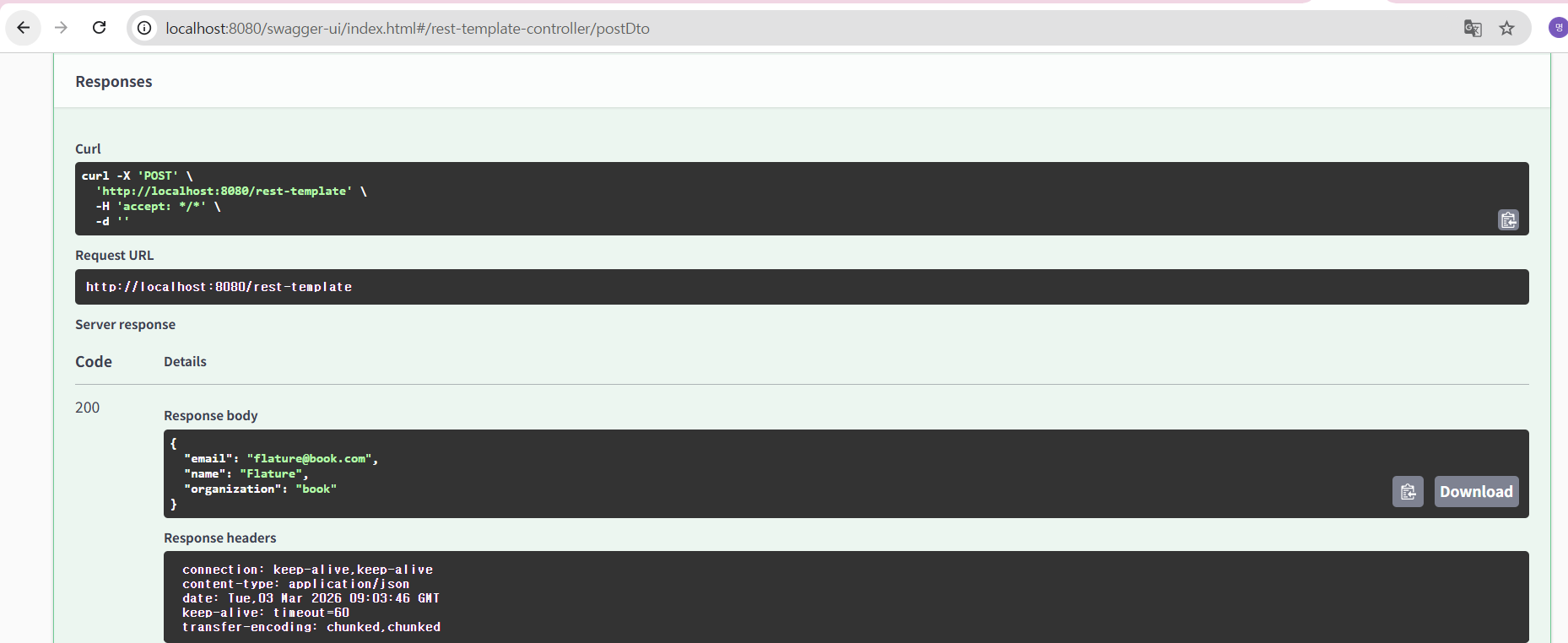 (6) 서버(resttemplate 프로젝트) 실행 후, swagger 페이지(http://localhost:8080/swagger-ui/index.html)에서 postDto() 메서드 호출한 결과