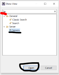 2) Show View 창에서 Servers 검색 및 선택 후 Open 버튼 클릭
