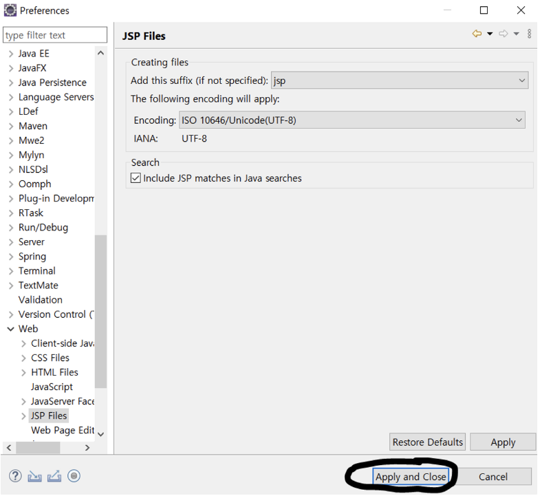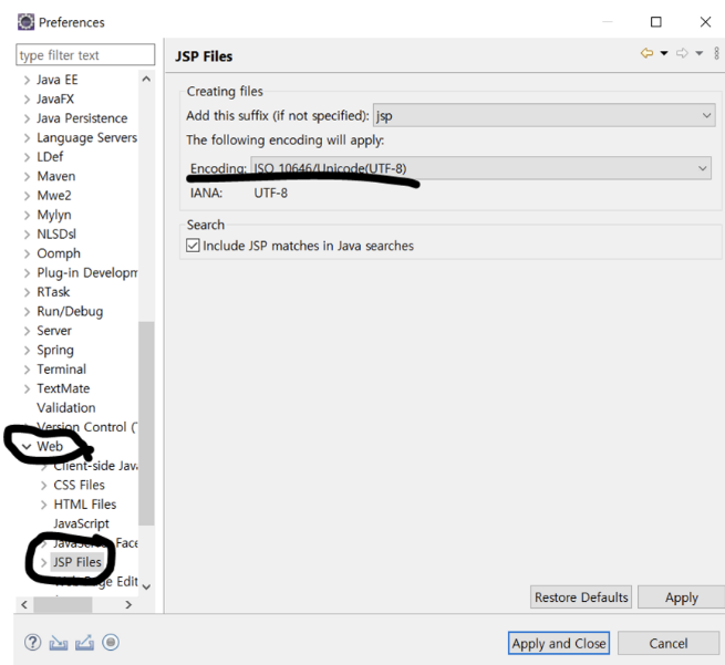 3) Preferences 창에서 [Web] → [CSS Files], [HTML Files], [JSP Files] 항목 모두의 [Encoding]을 UTF-8로 변경