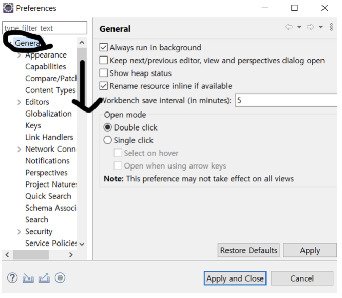2) Preferences 창에서 [General] → [Workspace]를 선택하고(화살표 방향으로 스크롤 바 내리기), [Text file encoding] 부분을 UTF-8로 변경